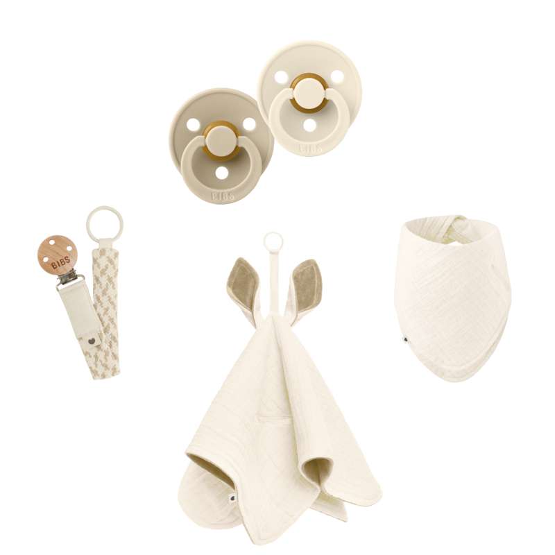 Denna bundle består av en Kangaroo nusseklud och en haklapp i ekologisk, mjuk muslinbomull. Dessutom ingår 2 st. BIBS Rund Colour nappar i storlek 2 - och en napphållare.