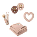 Denna bundle består av en 2-pack tygblöjor i ekologisk, mjuk muslinbomull. Därutöver ingår en bitring, 2 st. BIBS Rund Colour nappar i storlek 2 - och en napphållare.