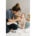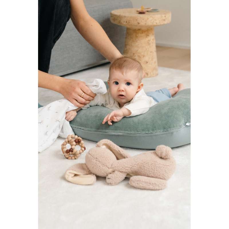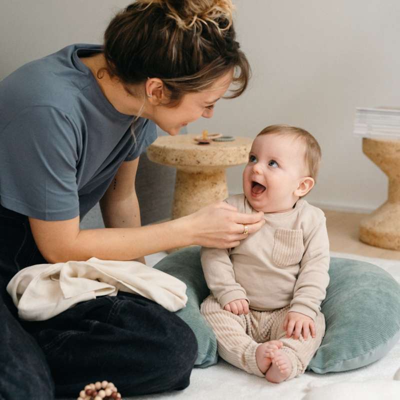 Den runde Doomoo-ammepude giver muligheden for at sidde godt rundt om mors mave. Puden er fyldt med små EPS-kugler, der dannes efter mor og baby's krop. Det er blødt og behageligt og bevarer sin fylde gennem amning uden at synke sammen. På denne måde mister babyen ikke grebet om brystvorten og får en optimal ammeposition.