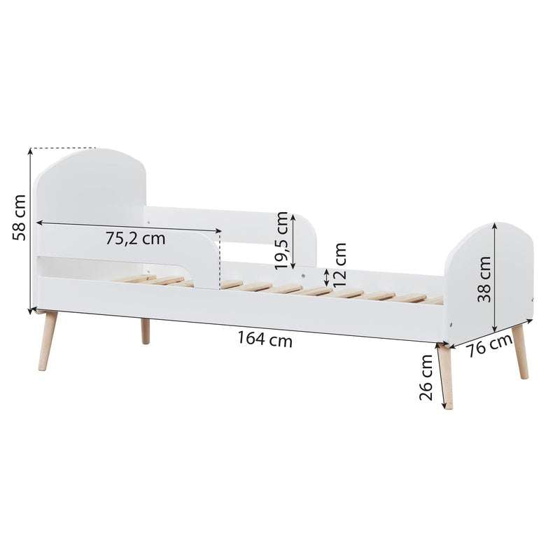 Sengens robuste ramme lavet af MDF giver pålidelig støtte og holdbarhed, mens de smukke egetræsben tilføjer en naturlig varme til børneværelset. Størrelsen på 70x160 cm giver god plads samtidig med, at den passer perfekt ind i mindre rum.