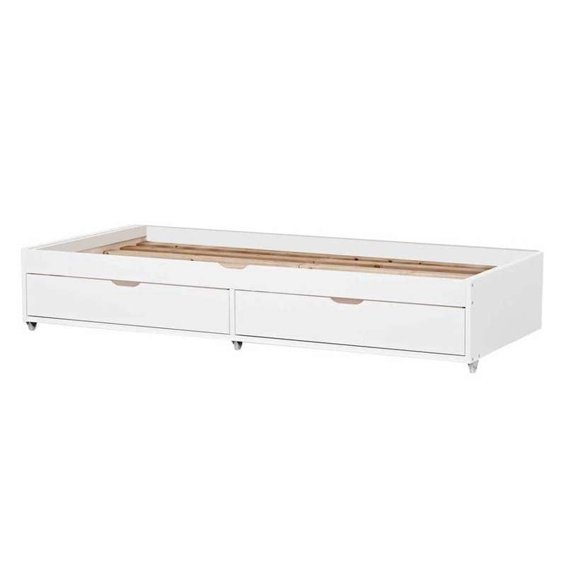 Udtrækningssengen fra DELUXE-serien er hvid og fås i to størrelser. Disse to størrelser passer begge senge som er 90x200 cm, dog er den ene udtrækningsseng smallere.