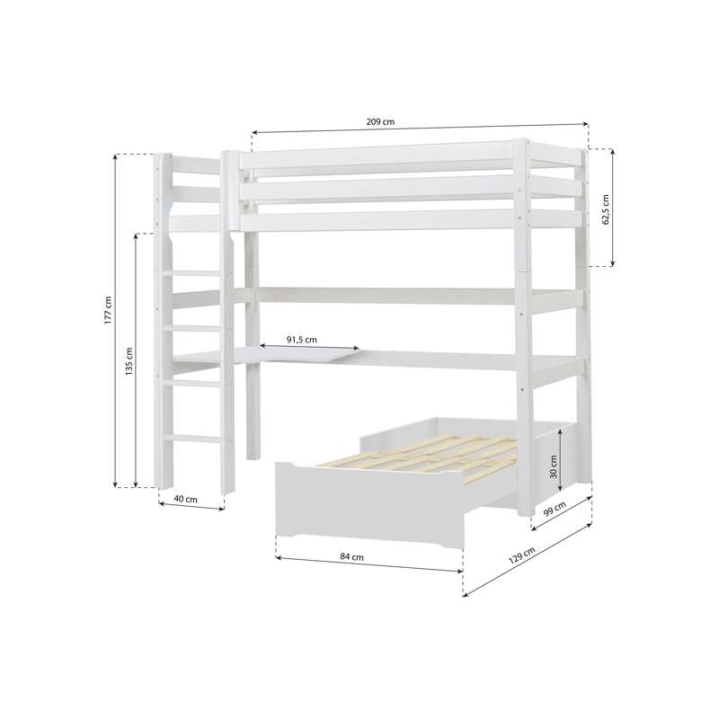 Den smarte MEGA seng i størrelse 90x200 cm fra Hoppekids er soveplads, arbejdsplads og lounge-område i ét. Lounge-modulet er fleksibelt og kan både bruges som siddeplads eller soveplads til overnattende gæster. Sættet indeholder højseng inkl. lameller, sengehest og stige, bordplade og lounge modul inkl. lameller. Sættet er overfladebehandlet med miljøvenlig, vandbaseret lak.