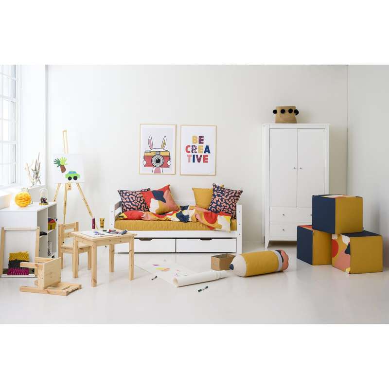 Den siddende terning fra Hoppekids kan både fungere som legetøj og som en sjov stol til børneværelset. Den farverige terning er let nok til, at barnet selv kan flytte rundt på den.