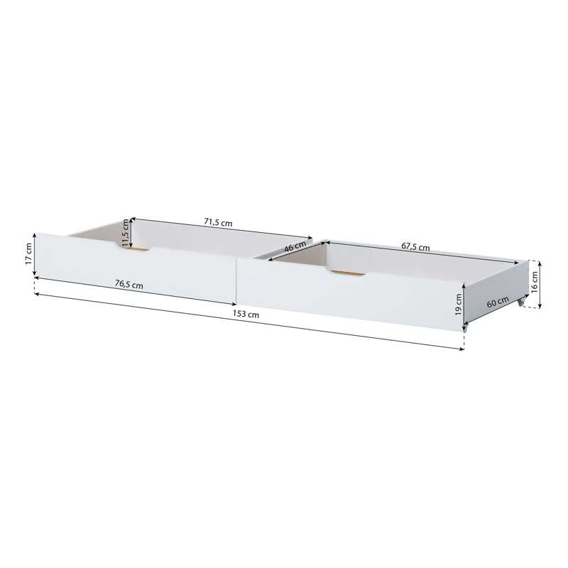 Varianten 70x160 cm har en yttre storlek på B153xH19xD60 för båda lådorna.