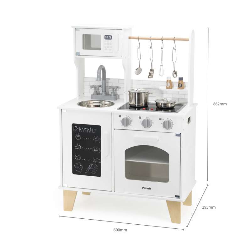 Med realistiske detaljer som kogeplade med lys og lyd, drejeknapper og ovnlåge, får barnet en leg, der både engagerer og inspirerer. Den medfølgende kridttavle er perfekt til at skrive dagens menu eller små beskeder, mens tilbehøret – gryder, skeer, krydderibøsser og meget mere – gør legen komplet fra første dag.