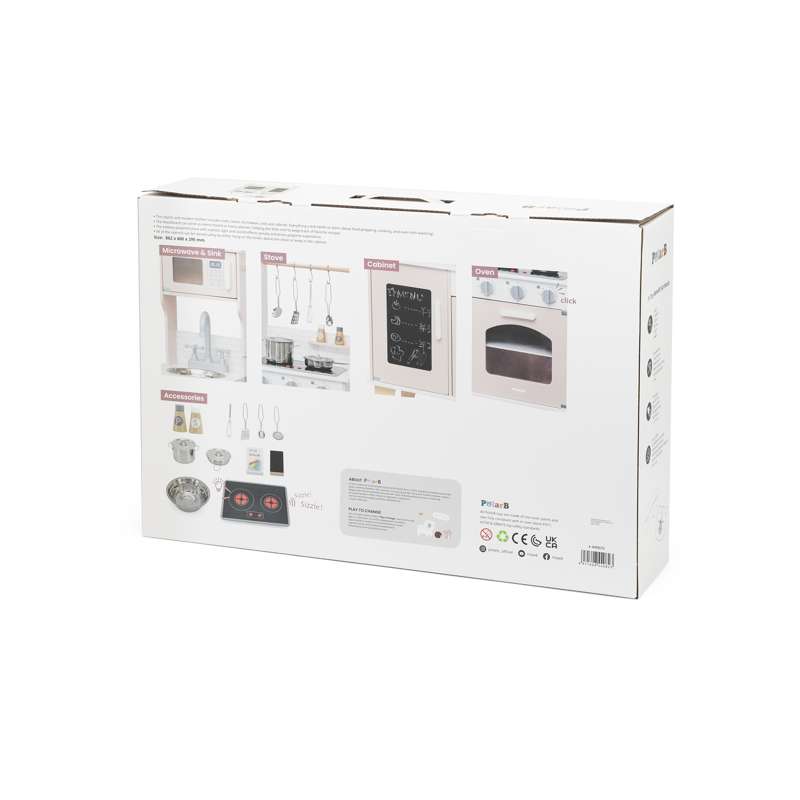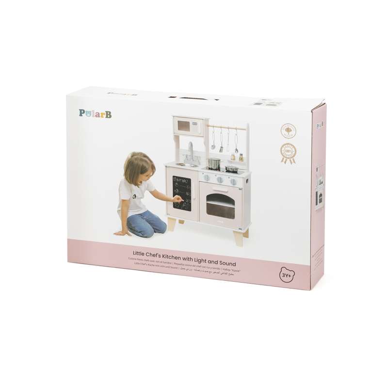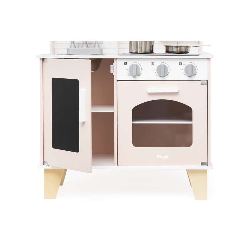 Med realistiske detaljer som kogeplade med lys og lyd, drejeknapper og ovnlåge, får barnet en leg, der både engagerer og inspirerer. Den medfølgende kridttavle er perfekt til at skrive dagens menu eller små beskeder, mens tilbehøret – gryder, skeer, krydderibøsser og meget mere – gør legen komplet fra første dag.