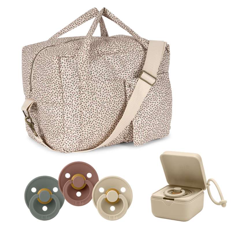 Den fina paketet består av Skötväskan - All You Need Bag från Konges Sløjd samt 3 BIBS-nappar med rundat huvud i naturgummi, i storlek 2 - och en färgkoordinerad nappbox från BIBS, med plats för 3 nappar.
