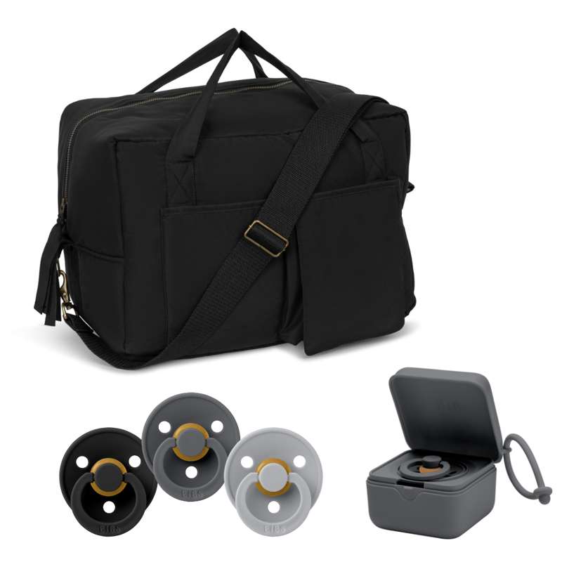 Den fina paketet består av Skötväskan - All You Need Bag från Konges Sløjd samt 3 BIBS-nappar med rundat huvud i naturgummi, i storlek 2 - och en färgkoordinerad nappbox från BIBS, med plats för 3 nappar.
