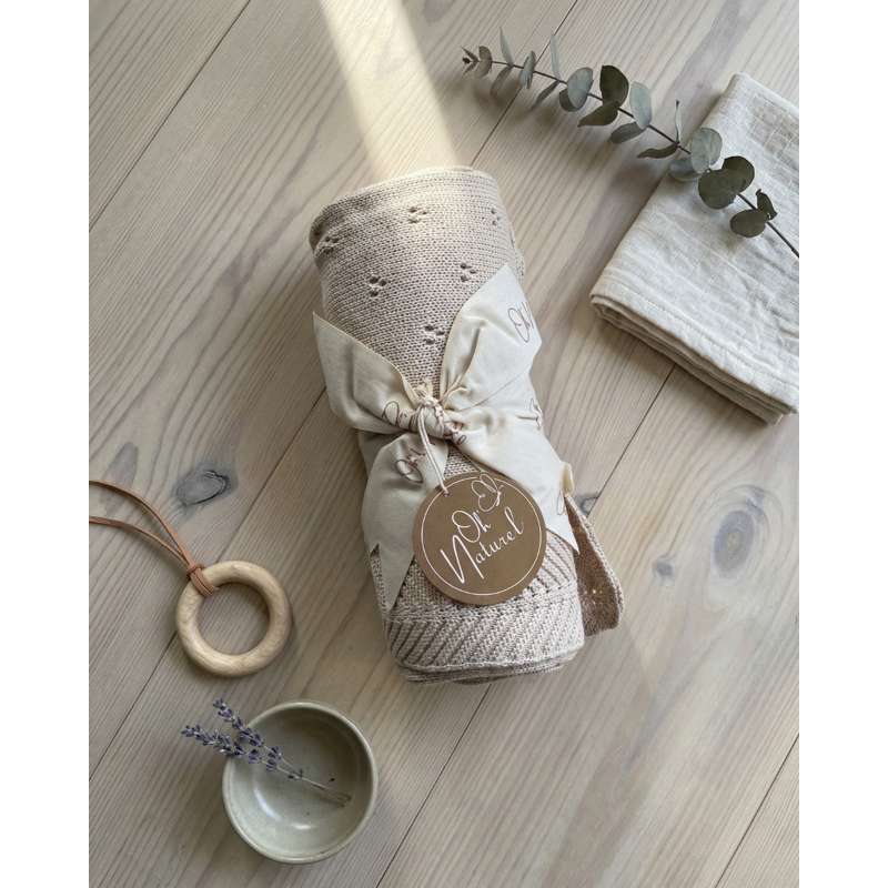 Det elegante babytæppe fra Oh’Naturel forener bæredygtighed, kvalitet og æstetik i et tidløst udtryk. Tæppet er strikket i 100% GOTS-certificeret bomuld og er derfor blødt mod sart hud og fremstillet under ansvarlige forhold. Størrelsen på 80×100 cm gør det alsidigt i hverdagen: et lunt lag i tremmesengen, en tryg makker til barnevognen og en hyggelig ledsager på sofaen. Det fine hulmønster giver et let, luftigt fald og bidrager til god åndbarhed, så barnet holdes behageligt tempereret året rundt.