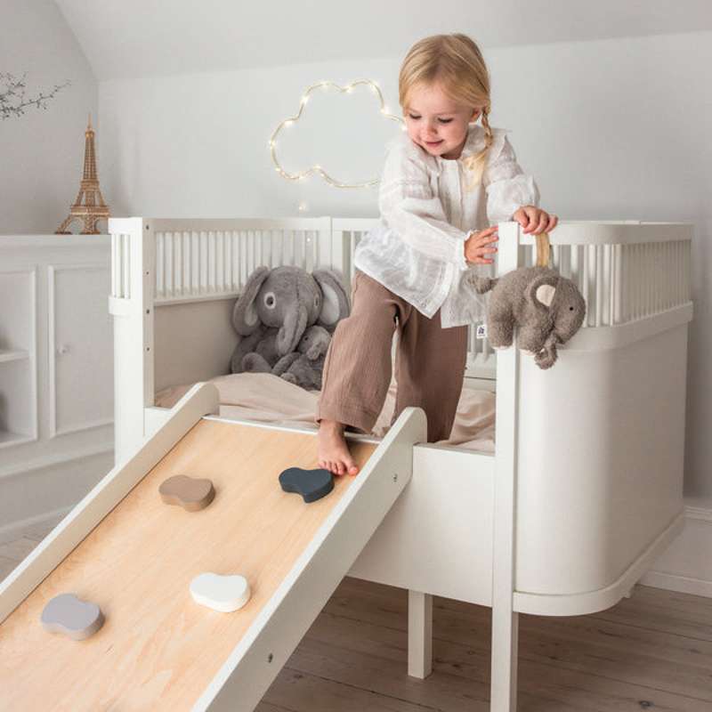 Skapa motoriska utmaningar för ditt barn genom att montera klätter- och rutsjebanan på Sebra Sängen eller Sebra Klättertriangeln.