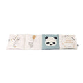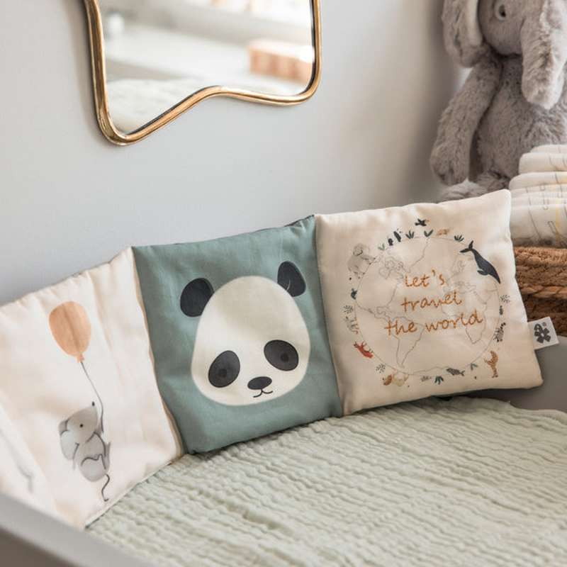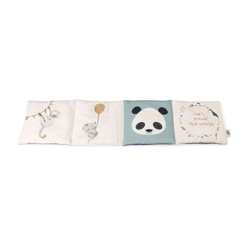 Stoffboken har fyra underhållande dubbelsidor som kan vikas som ett dragspel och visar