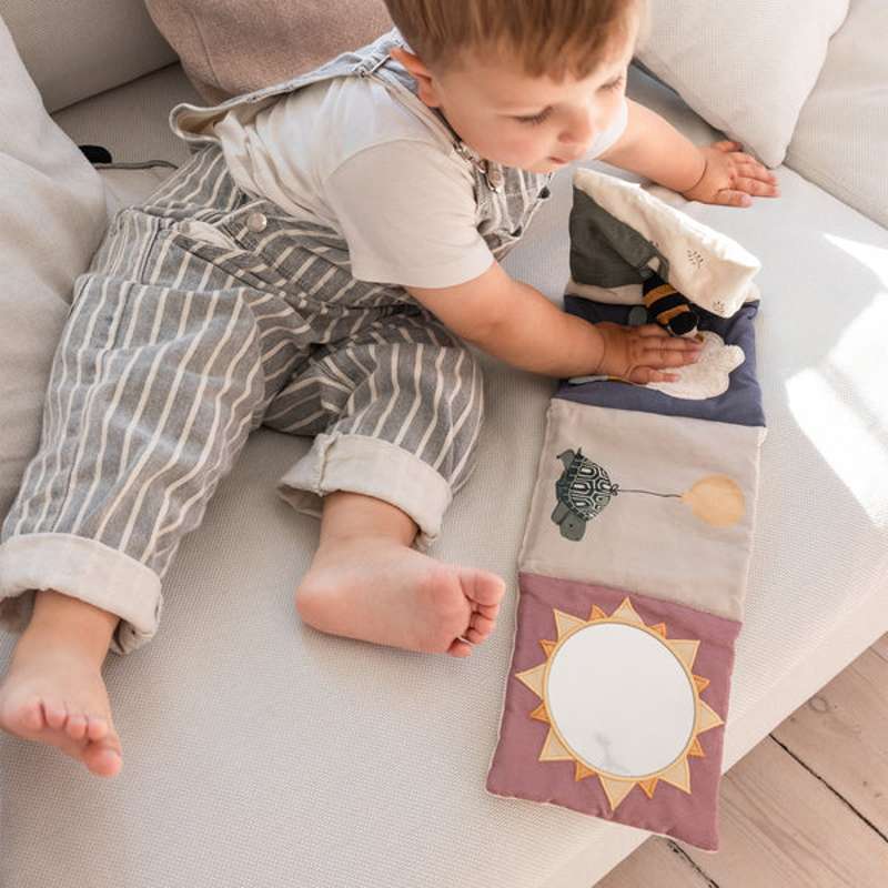Alla sidor är designade för att stimulera din babys sinnen så mycket som möjligt. Den mjuka molnet, den babysäkra spegeln och en bi med ljuddefekt är detaljer som baby kan titta på, röra vid och lyssna på.