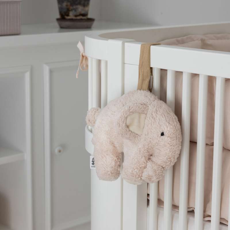 Fanto är 15 cm hög och utrustad med ett praktiskt kardborreband som gör den lätt att fästa vid sängen, aktivitetsstativet, bilstolen eller andra ställen där den kan skapa värde. Elefanten har mjuka öron och en knut på svansen som små fingrar kan nypa och finna trygghet i.