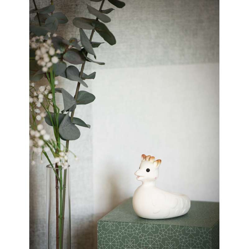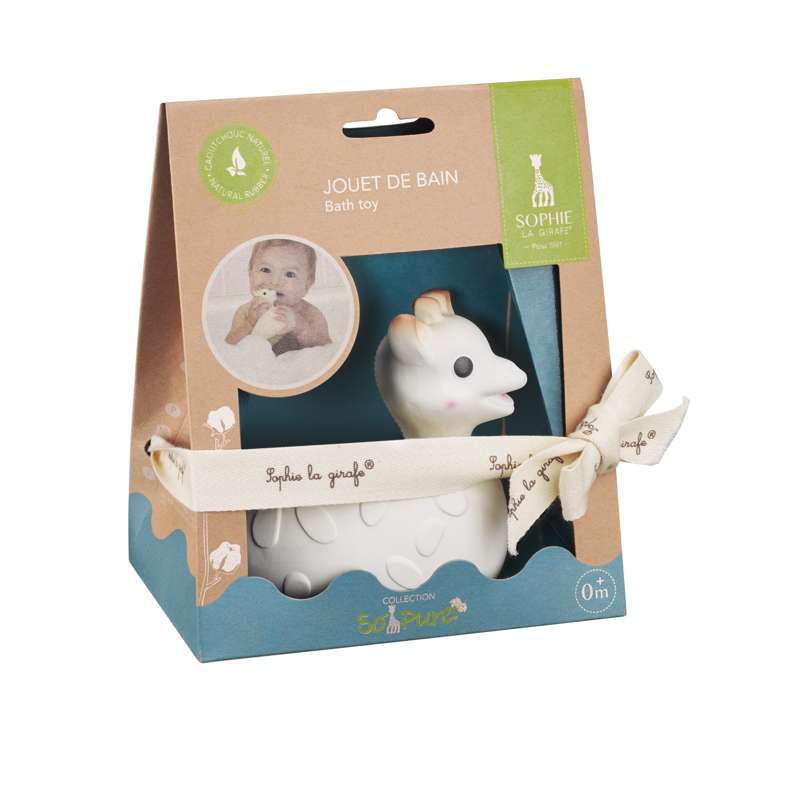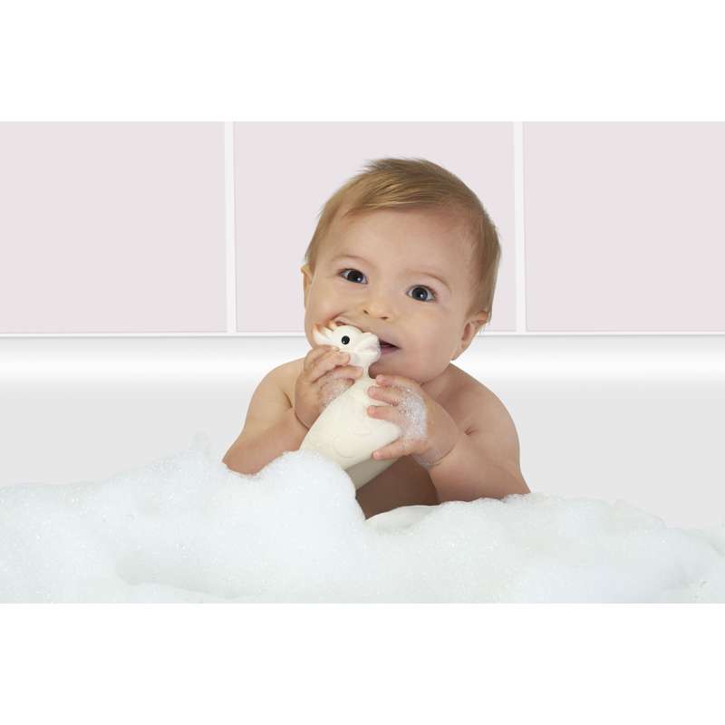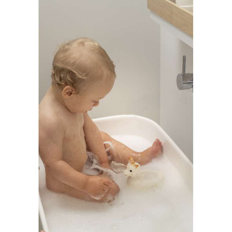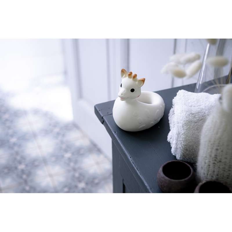 Badgiraffen har ett huvud som Sophie la Girafe och en stor ring fylld med luft, vilket gör den flytande och lätt att hålla för bebisen.